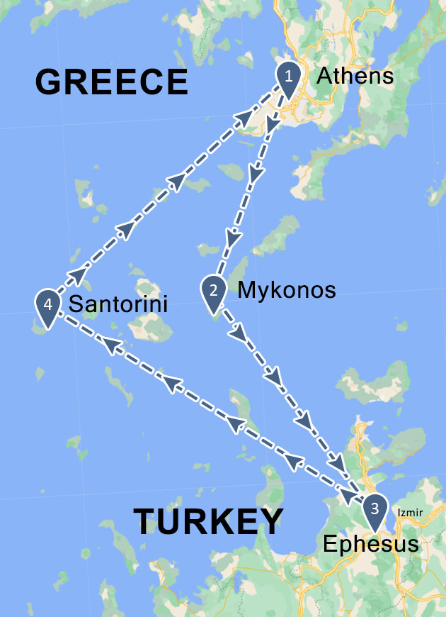 • Cities: Athens, Ephesus, Corinth, Patmos, Crete, Santorini