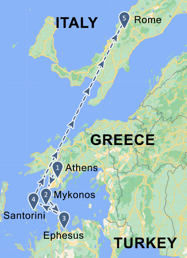 • Cities: Athens, Ephesus, Corinth, Patmos, Crete, Santorini, Rome