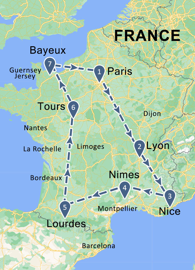 • Cities: Paris, Lyon, Nice, Nimes, Lourdes, Tours, Bayeux