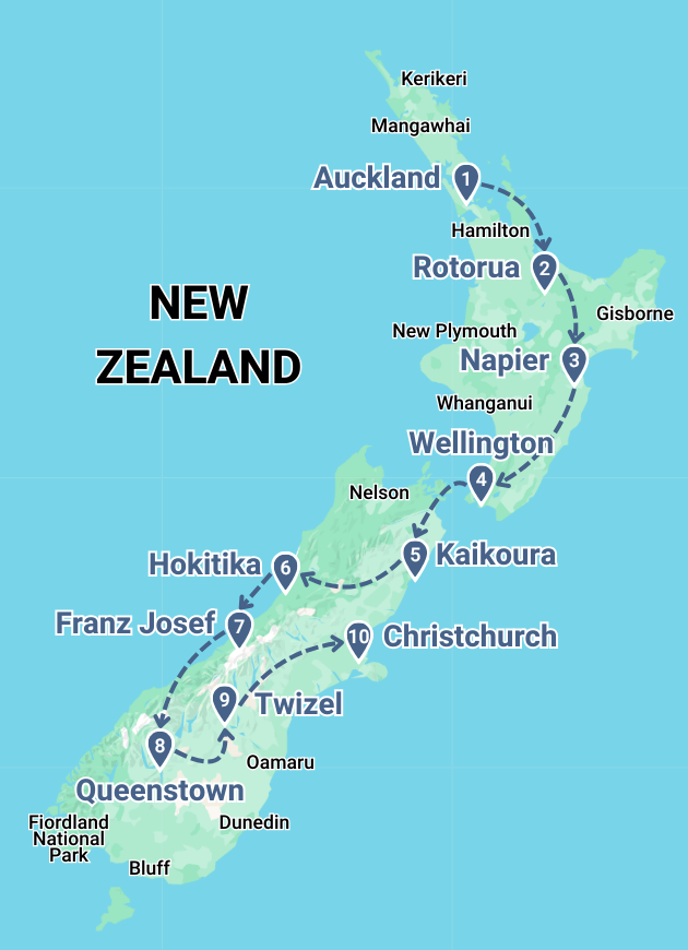 • Cities: Auckland, Rotorua, Napier, Wellington, Kaikoura, Hokitika, Franz Josef, Queenstown, Twizel, Christchurch