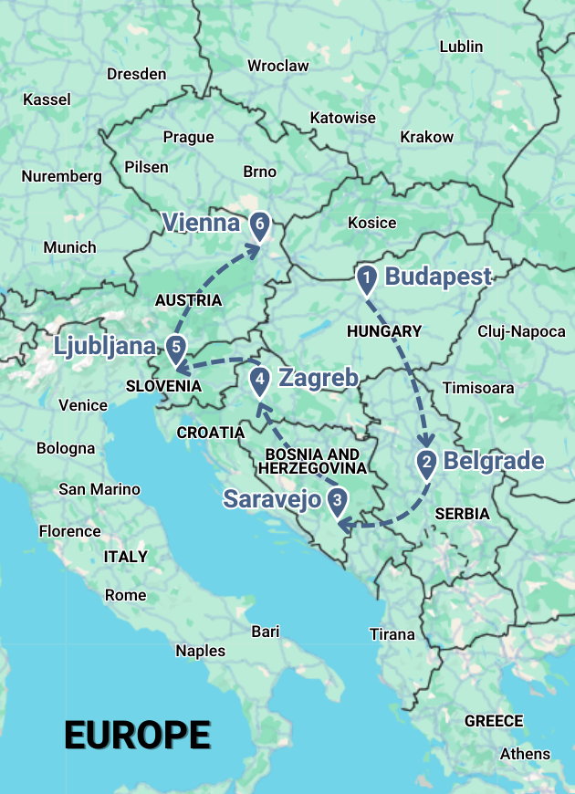 • Cities: Budapest, Belgrade, Sarajevo, Zagreb, Ljubljana, Vienna